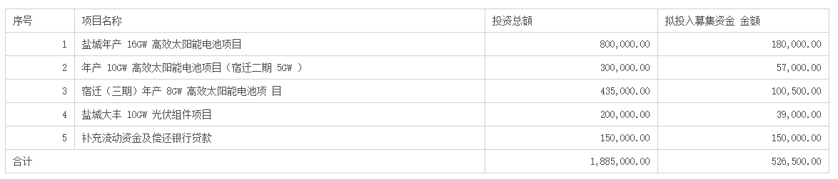 12月29日,天合光能發(fā)布向不特定對象發(fā)行可轉(zhuǎn)換公司債券預(yù)案,擬發(fā)行可轉(zhuǎn)換公司債券總額不超過人民幣52.65億元(含),所募集資金扣除發(fā)行費(fèi)用后的資金凈額將用于投入鹽城年產(chǎn)16GW高效太陽能電池項(xiàng)目、年產(chǎn)10GW高效太陽能電池項(xiàng)目(宿遷二期5GW)、宿遷(三期)年產(chǎn)8GW高效太陽能電池項(xiàng)目、鹽城大豐10GW光伏組件項(xiàng)目、補(bǔ)充流動資金及償還銀行貸款。