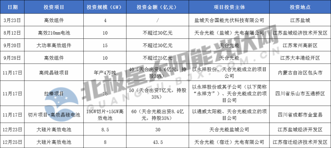 據(jù)北極星太陽能光伏網(wǎng)統(tǒng)計(jì),2020年開年至今,天合光能已進(jìn)行9次擴(kuò)產(chǎn)動作,內(nèi)容涵蓋硅料、電池片、組件三個環(huán)節(jié),總投資超179.5億元,項(xiàng)目地點(diǎn)分布于江蘇、四川、內(nèi)蒙古等地。