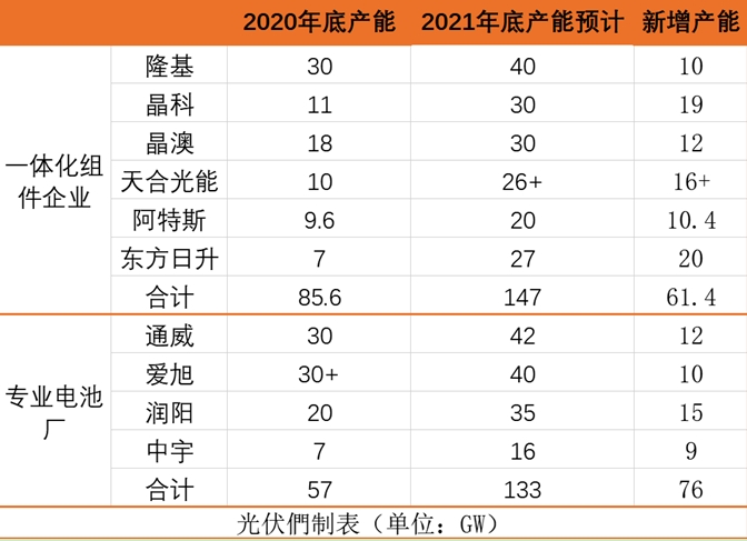然而,2020年以來(lái),光伏電池的擴(kuò)產(chǎn)規(guī)劃正像洪水一樣涌來(lái)。據(jù)光伏們不完全統(tǒng)計(jì),到2021年底,國(guó)內(nèi)六大組件企業(yè)的電池產(chǎn)能合計(jì)將超過(guò)140GW,加上四家專業(yè)電池廠商,合計(jì)總產(chǎn)能超過(guò)240GW,當(dāng)年新增產(chǎn)能超過(guò)100GW。