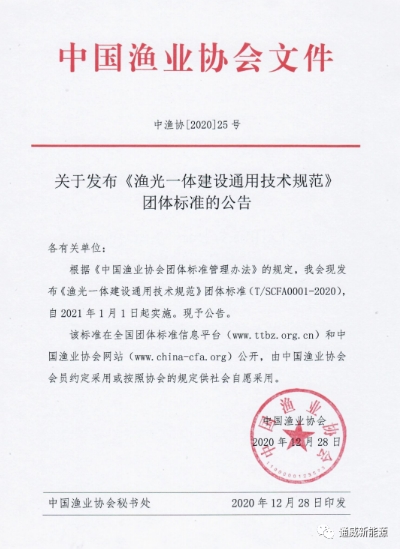 12月28日,由通威新能源公司編制的中國(guó)漁業(yè)協(xié)會(huì)團(tuán)體標(biāo)準(zhǔn)——《漁光一體建設(shè)通用技術(shù)規(guī)范》通過(guò)評(píng)審公示并公布,將于2021年1月1日正式實(shí)施。該標(biāo)準(zhǔn)將在全國(guó)團(tuán)體標(biāo)準(zhǔn)信息平臺(tái)(www.ttbz.org.cn)和中國(guó)漁業(yè)協(xié)會(huì)網(wǎng)站(www.china-cfa.org)公開(kāi)。