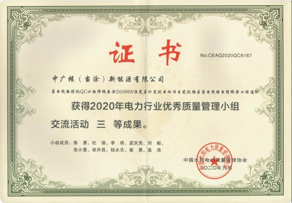 ▲中廣核新能源安徽分公司榮獲全國電力行業(yè)QC成果獎