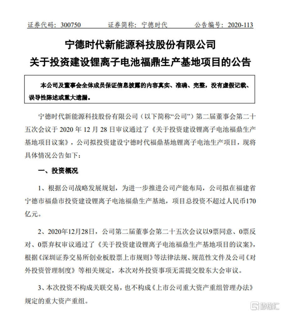 此外,公司擬在福建省寧德市福鼎市投資建設(shè)動(dòng)力電池生產(chǎn)基地,項(xiàng)目總投資不超過170億元;擬在江蘇省溧陽(yáng)市中關(guān)村高新區(qū)內(nèi),投資建設(shè)江蘇時(shí)代動(dòng)力及儲(chǔ)能鋰電池研發(fā)與生產(chǎn)項(xiàng)目(四期),項(xiàng)目總投資不超過120億元。