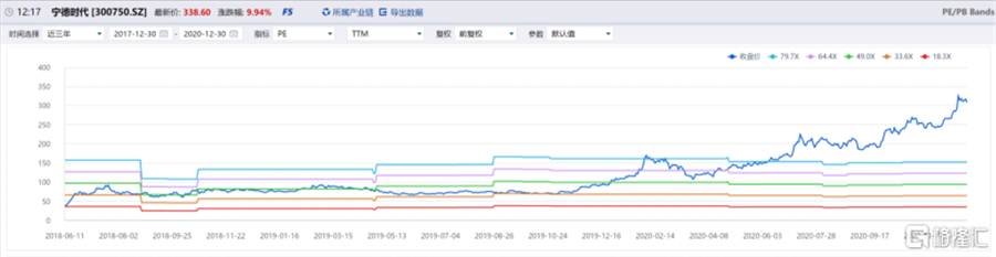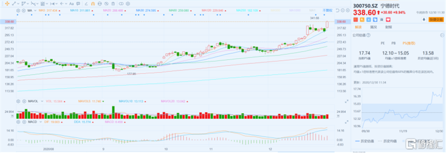 新能源汽車動(dòng)力電池龍頭寧德時(shí)代12月30日股價(jià)高開4%,漲幅在早盤一度擴(kuò)大至11%以上,最高報(bào)341元每股,再創(chuàng)歷史新高。今年以來(lái),公司股價(jià)以上漲2倍多,市值提升了5400多億元,最新市值已接近8000億元。