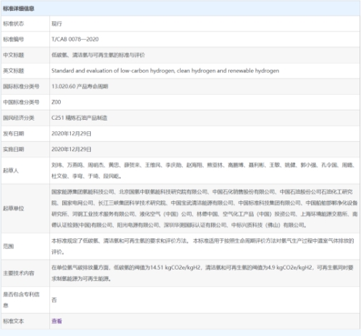 2020年12月29日,由中國(guó)氫能聯(lián)盟提出的《低碳?xì)洹⑶鍧崥渑c可再生能源氫的標(biāo)準(zhǔn)與評(píng)價(jià)》正式發(fā)布實(shí)施。