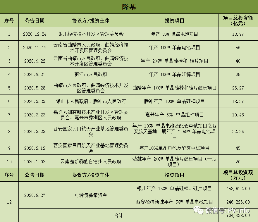 2020年1月2日,晚間,隆基股份再次宣布擴(kuò)產(chǎn)計(jì)劃。2020年1月2日,晚間,隆基股份再次宣布擴(kuò)產(chǎn)計(jì)劃。公告稱(chēng),2019年12月31日,隆基與楚雄州、祿豐縣簽訂項(xiàng)目投資協(xié)議,就隆基在楚雄新增投資建設(shè)年產(chǎn)20GW單晶硅片項(xiàng)目(下稱(chēng)三期項(xiàng)目)達(dá)成合作意向。