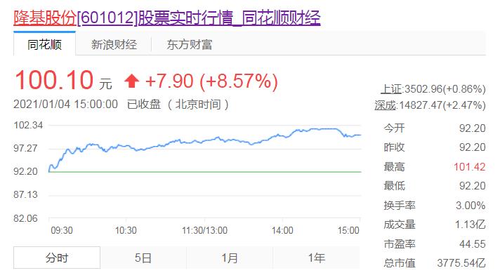 截止今日收盤,隆基股份每股價格100.01元,漲幅達到8.57%,總市值3775.54億元。