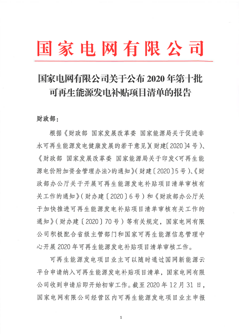 關(guān)于公布2020年第十批可再生能源發(fā)電補(bǔ)貼項(xiàng)目清單的公告