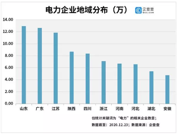 從省份分布來看,企查查數(shù)據(jù)顯示,山東省的電力相關(guān)企業(yè)數(shù)量排名第一,共12.94萬家。廣東、江蘇、陜西的企業(yè)數(shù)量分別以12.63萬家、11.84萬家和8.69萬家排在2-4位。