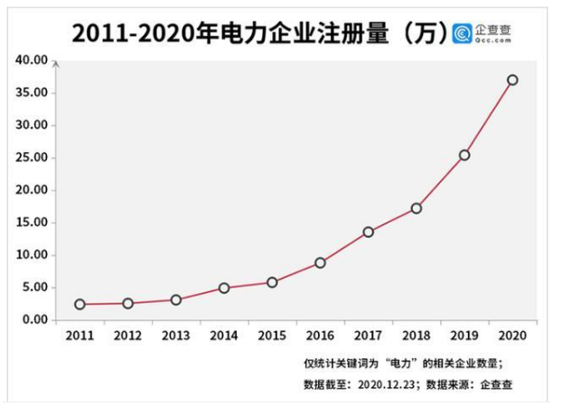 2011年以來的十年間,電力相關(guān)企業(yè)注冊量呈逐年遞增趨勢。企查查數(shù)據(jù)顯示,2011年共注冊2.39萬家,2020年共注冊36.97萬家,同比增長46%,是2011年注冊量的15倍。