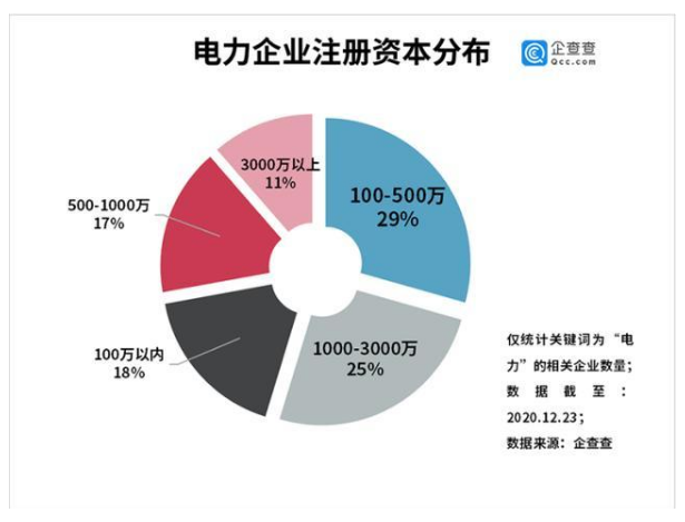 從企業(yè)類型來看,電力企業(yè)中有限責(zé)任公司數(shù)量較多,共125.31萬家,占比約為94%。從注冊資本來看(個體工商戶除外),企查查數(shù)據(jù)顯示,電力相關(guān)企業(yè)的注冊資本分布較為均勻,在100-500萬元的有29%,占比為29%,注冊資本在100萬元以內(nèi)的占24%。總體來看,注冊資本高于1000萬的企業(yè)占比36%。