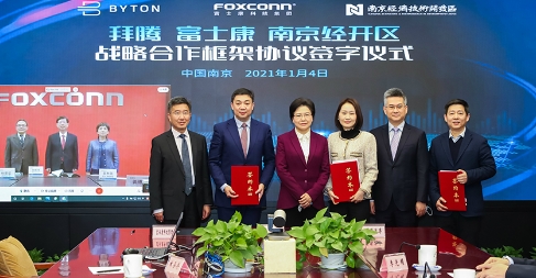 昨日,拜騰、富士康和南京經(jīng)濟(jì)技術(shù)開發(fā)區(qū)正式簽署了戰(zhàn)略合作框架協(xié)議,以共同加快實(shí)現(xiàn)在2022年一季度前實(shí)現(xiàn)拜騰首款車型M-Byte量產(chǎn)的目標(biāo)。富士康是目前全球最大的電子產(chǎn)品制造商,曾為特斯拉提供汽車零部件。去年1月,富士康母公司鴻海精密工業(yè)有限公司決定和菲亞特克萊斯勒組建合資企業(yè),以便在中國開發(fā)和生產(chǎn)電動(dòng)汽車。南京經(jīng)濟(jì)技術(shù)開發(fā)區(qū)于1992年成立,2002年被列為國家級(jí)開發(fā)區(qū)。根據(jù)此次合作協(xié)議,富士康將提供在先進(jìn)制造技術(shù)方面的專業(yè)知識(shí)、運(yùn)營管理經(jīng)驗(yàn),并和拜騰共享產(chǎn)業(yè)資源,以此為電動(dòng)SUV M-Byte的量產(chǎn)提供支持。
