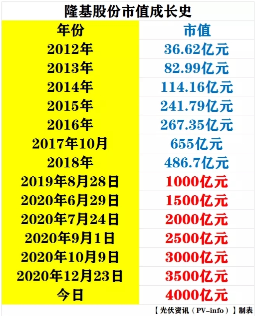 微信公眾號(PV-info)了解到 今日,光伏行業(yè)的龍頭企業(yè)-隆基股份市值正式突破4000億元!