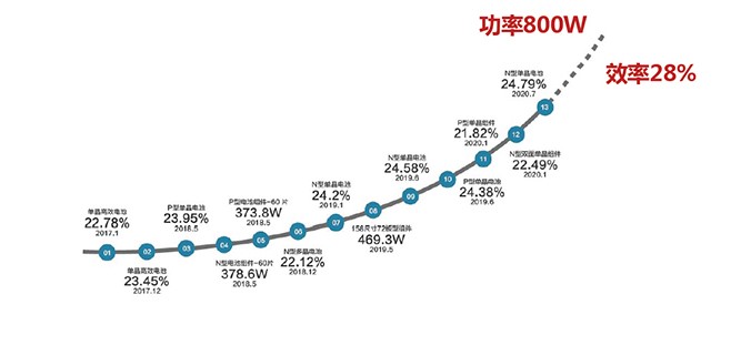 15次打破電池效率和組件功率世界記錄,保持24.9%電池效率記錄。量產(chǎn)組件功率550W+,組件效率22%。