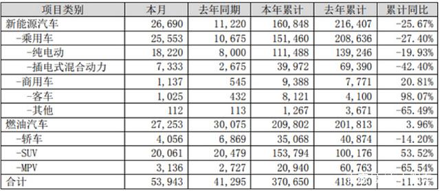 據(jù)比亞迪發(fā)布的11月銷量數(shù)據(jù)顯示,11月銷售新能源汽車26690輛,去年同期為11220輛,銷量同比實(shí)現(xiàn)翻番還多,這應(yīng)該是比亞迪今年表現(xiàn)最好的月份。但是,銷量數(shù)據(jù)同時(shí)顯示,本年累計(jì)銷量160848輛,而去年同期銷量為216407輛,累計(jì)同比銷量下滑25.67%。再細(xì)分,在乘用車、純電動(dòng)、插電式混合動(dòng)力、轎車、MPV等版塊,比亞迪幾乎全線下滑,僅在商用車、客車、燃油汽車以及SUV領(lǐng)域呈現(xiàn)上漲勢(shì)頭。
