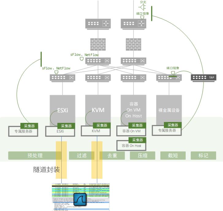 2016年起我們就開始了客戶落地。當(dāng)時(shí),客戶的訴求很直接,就是要看到虛擬網(wǎng)絡(luò)中的流量,其中存在的挑戰(zhàn)包括避免對生產(chǎn)環(huán)境的侵?jǐn)_、保障性能的同時(shí)限制采集系統(tǒng)對資源的使用、能實(shí)現(xiàn)策略跟隨以及支持隧道分發(fā)。客戶的環(huán)境與現(xiàn)在還是有些區(qū)別,資源池類型主要是ESXi、XEN以及KVM,理念上也是關(guān)注全包。DeepFlow®方案的重點(diǎn)就是采集與分發(fā),為客戶解決虛擬機(jī)間的東西向流量采集難題以及流量引出。需要做到避免侵?jǐn)_數(shù)據(jù)面,在有限的資源使用下保障性能,在虛擬機(jī)發(fā)生遷移后,確保采集分發(fā)策略的統(tǒng)一及跟隨。通過隧道封裝,保時(shí)保序地將數(shù)據(jù)包分發(fā)至各類分析工具處。在這個(gè)階段,DeepFlow®實(shí)現(xiàn)了面向各類資源池的網(wǎng)絡(luò)流量“采集處理抽象層”,統(tǒng)一提供采集、多維過濾、去重、壓縮、截短等預(yù)處理功能。抽象層中的各類型采集器本身也是一套分布式系統(tǒng),為后期面向大規(guī)模多類型的云環(huán)境監(jiān)控中高性能數(shù)據(jù)處理提供基礎(chǔ)保障。