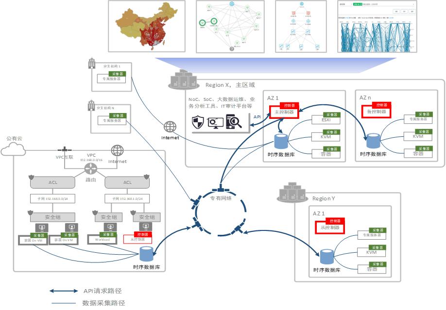 在中期階段,客戶業(yè)務(wù)逐步上云,云建設(shè)的規(guī)模更大,同時(shí)開始關(guān)注容器網(wǎng)絡(luò)以及業(yè)務(wù)保障。這時(shí)客戶更多地關(guān)注多區(qū)域多資源池以及underlay和overlay的統(tǒng)一管理、對于多云異構(gòu)環(huán)境有統(tǒng)一網(wǎng)絡(luò)全景圖的需求、對虛擬網(wǎng)絡(luò)的故障診斷需求也浮出水面。客戶理念上也不再認(rèn)為云環(huán)境的網(wǎng)絡(luò)保障可單純地通過存儲、分析全包來解決。此時(shí)面臨的多點(diǎn)多地管理,Overlay網(wǎng)絡(luò)中的Trouble shooting等問題也很突出。DeepFlow®方案著重面向客戶大規(guī)?;旌显凭W(wǎng)絡(luò)的整體監(jiān)控,包括多數(shù)據(jù)中心、多分支機(jī)構(gòu)、私有云和公有云的整體網(wǎng)絡(luò)全景圖,解決專線鏈路負(fù)載、公有云網(wǎng)絡(luò)性能、私有云故障排查等系列問題。在此階段,DeepFlow®控制器集群不僅具備了管理10萬采集點(diǎn)規(guī)模的能力,而且廣泛地與云平臺、CMDB對接,使網(wǎng)絡(luò)IP、流量與VPC、虛擬機(jī)、POD、服務(wù)、平臺事件等關(guān)聯(lián),繪制一整張網(wǎng)絡(luò)知識圖譜。