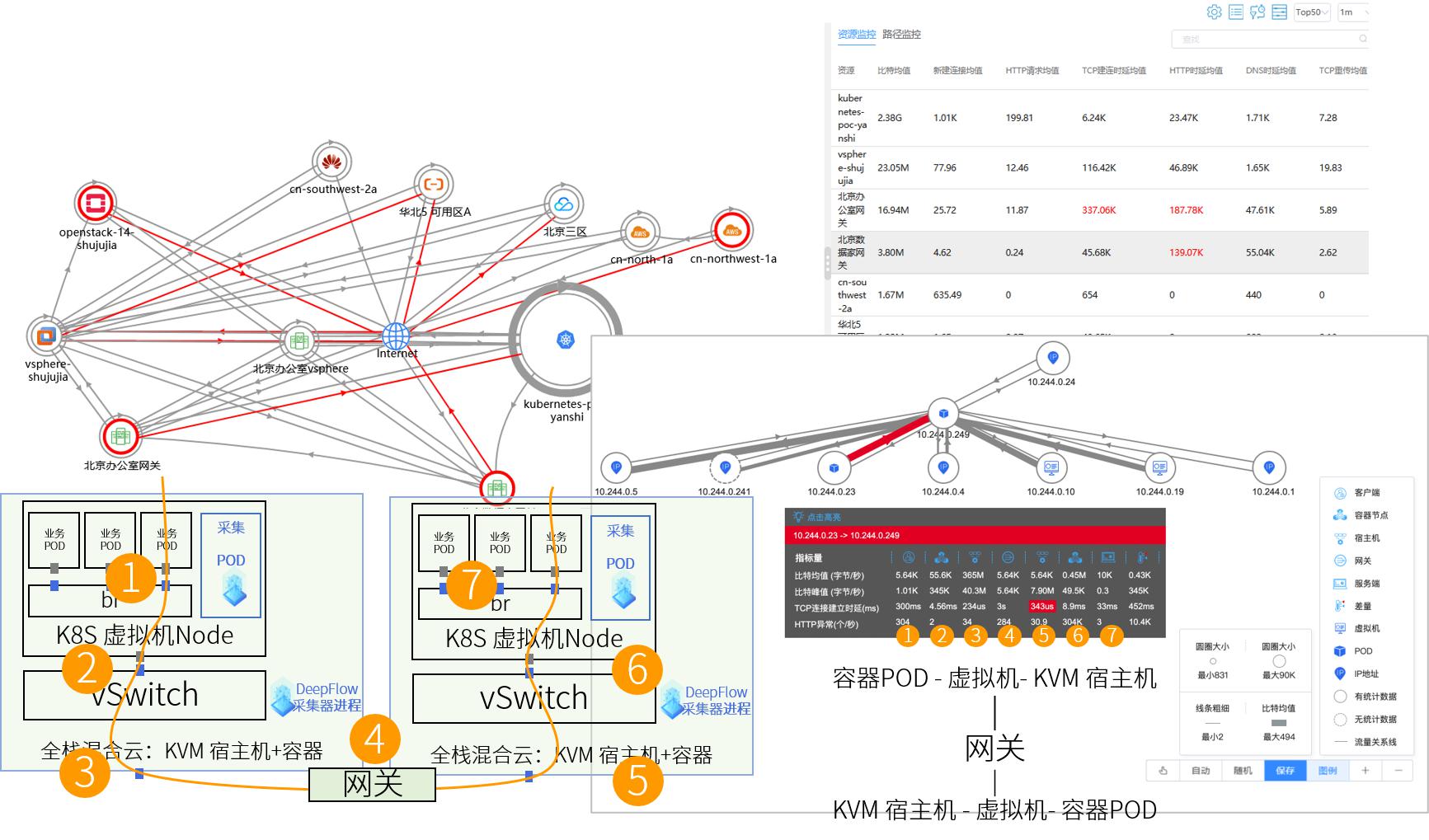 容器、虛擬機(jī)、宿主機(jī)的結(jié)合,也是常見的全棧場景,產(chǎn)品通過“全景圖”不同維度的查詢展示來描述各層面的關(guān)系。圖中的“點(diǎn)”可以是數(shù)據(jù)中心、可用區(qū),可以是虛擬機(jī)、容器POD,可以是VPC、網(wǎng)段、IP,也可以是Service、資源組等。“點(diǎn)”與“點(diǎn)”之間的連線可以設(shè)置為流量、調(diào)用關(guān)系的吞吐、延時(shí)、TCP連接狀態(tài)等指標(biāo)。當(dāng)看到兩個(gè)容器POD的連接延時(shí)超過閾值時(shí),客戶面臨的是一個(gè)復(fù)雜的全棧環(huán)境,涉及到POD、Bridge、vSwitch,再到東西向的Gateway,中間已進(jìn)行過多次地址轉(zhuǎn)換。DeepFlow®清晰地將每一步的指標(biāo)呈現(xiàn)出來,快速高效地定位問題點(diǎn)。這就是云杉為客戶提供的全棧跟蹤能力。