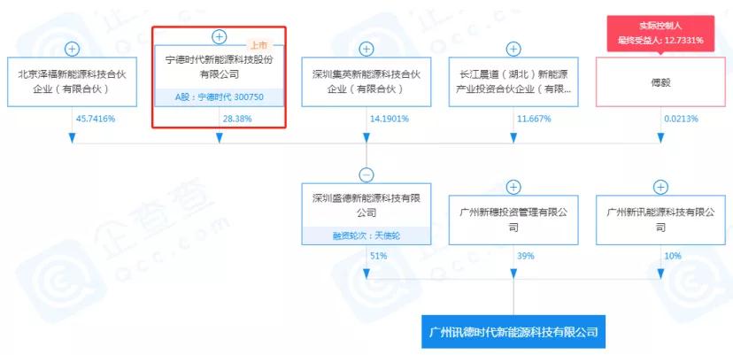 企查查顯示,廣州訊德時代新能源科技有限公司(簡稱訊德時代)成立于2019年1月,盛德新能源為其控股股東。寧德時代通過持有盛德新能源28.38%的股權(quán),間接控股訊德時代。