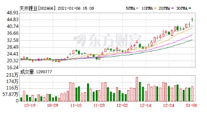 在此利好消息刺激下,天齊鋰業(yè)股價近期強勢反彈,自2020年11月以來,其股價已從23元/股附近,拉升至45.98元/股兩年多來的新高。
