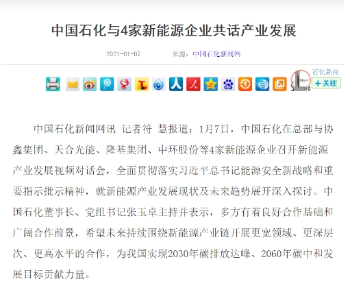 2020年12月8日,中國石化宣布旗下勝利油田1MW分布式光伏項目建設完成。同日,中國石化董事長張玉卓還率隊到訪太陽能單晶硅棒和硅片制造商隆基股份。