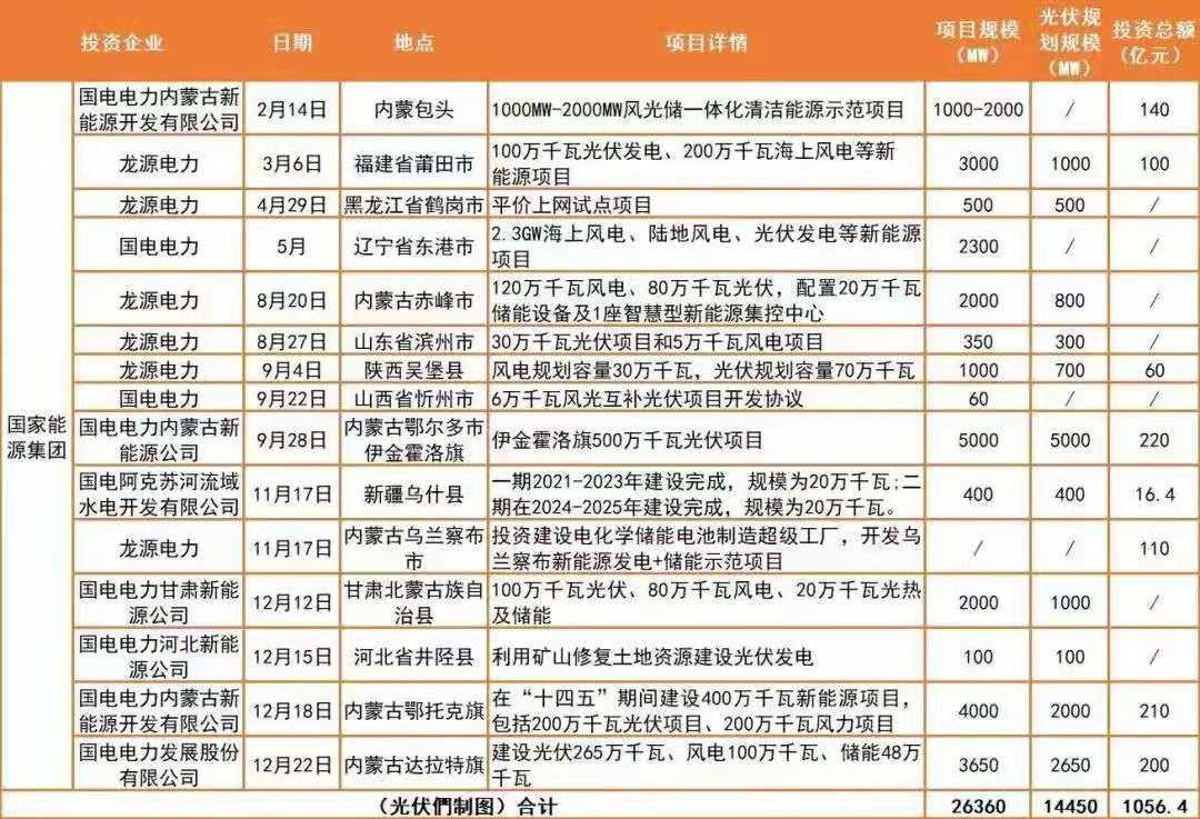此外,2020年國家能源集團(tuán)共簽約15個新能源投資建設(shè)項(xiàng)目,投資總額超千億元,總規(guī)模超過26GW,其中光伏近15GW,占比過半。項(xiàng)目遍及內(nèi)蒙古、福建、黑龍江、遼寧、新疆、甘肅、山東、山西、河北、陜西等10個省/自治區(qū)。