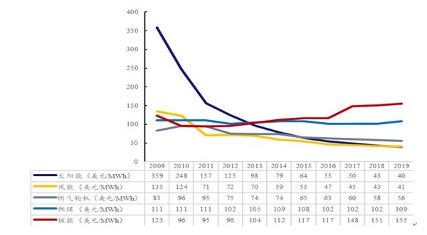 與此同時,經(jīng)過多年發(fā)展,光伏產(chǎn)業(yè)逐步走向成熟。根據(jù)興業(yè)證券經(jīng)濟與金融研究院數(shù)據(jù),過去十年,光伏發(fā)電成為所有發(fā)電類型中度電成本下降最快的類型之一,2009年至2019年光伏度電成本下降達89%,2019年平均度電成本已至40美分/kWh,光伏已經(jīng)是各類電源中成本最低的電源之一。