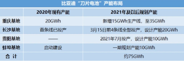 此外,弗迪貴陽工廠“刀片電池”生產(chǎn)線擬于2021年7月投產(chǎn),設計年產(chǎn)能為10GWh。