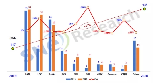 1月13日,韓國市場研究機構(gòu)SNE Research公布了2020年全球動力電池市場相關(guān)數(shù)據(jù)。報告顯示,2020年全球動力電池在電動車上的裝機量達137GWh,同比增長17%。