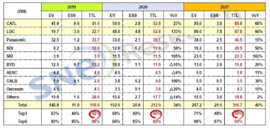 從數(shù)據(jù)可以看出,前三強的市場份額集中度在提高,從2019年的62.4%升至65.2%。與2019年相比,寧德時代裝機量增幅為2%,LG新能源增幅為150%,松下則下降了10.7%。 除了LG新能源之外,另外兩家韓國動力電池公司三星SDI和SKI的成績同樣出色,裝機量增幅分別達了81%和284%。