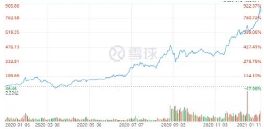 特斯拉股價也在2020年4月開始,開始了股價的急速拉升,在過去一年的統(tǒng)計區(qū)間內(nèi),特斯拉區(qū)間漲幅達到了815.58%。