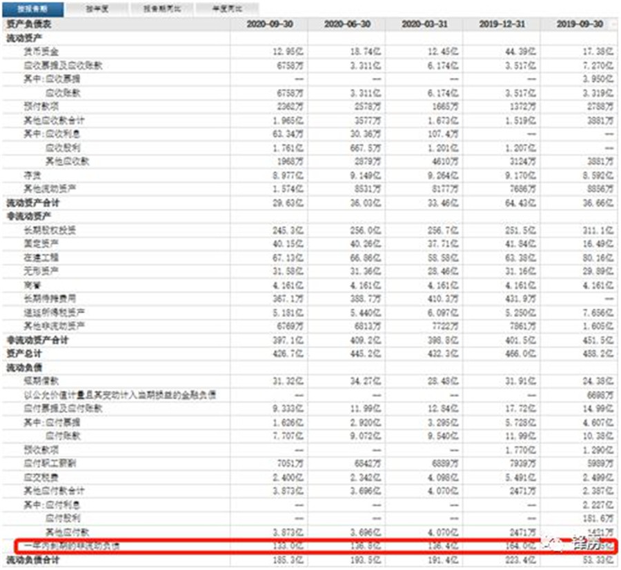 此外,2020年9月30日,天齊鋰業(yè)賬面短期借款31.32億元、一年內(nèi)到期的非流動(dòng)負(fù)債133億元以及長(zhǎng)期借款130.3億元,累計(jì)負(fù)債總金額294.62億元,其中需要公司短期償還的借款為164.32億元,而同期貨幣資金和應(yīng)收票據(jù)及應(yīng)收賬款合計(jì)不過(guò)近14億元。