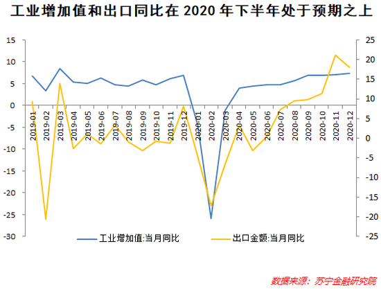2020年三季度政策逐漸回歸常態(tài)化,但受到外貿(mào)和房地產(chǎn)市場(chǎng)持續(xù)向好等因素的支撐,經(jīng)濟(jì)復(fù)蘇趨勢(shì)不減,且復(fù)蘇邏輯逐漸內(nèi)生化,制造業(yè)投資和線下服務(wù)業(yè)等順周期變量逐漸修復(fù),在四季度逐漸追上工業(yè)部門。最終2020年四季度GDP當(dāng)季同比增速還超過(guò)了2019年同期增速水平。