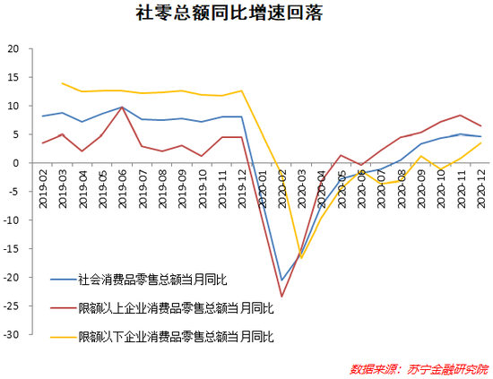 2020年12月社零總額同比增長(zhǎng)4.6%,較上月增速有所放緩,但仍為全年第二高。不過(guò),2020年12月開(kāi)始的疫情反復(fù)對(duì)國(guó)內(nèi)消費(fèi)產(chǎn)生了壓制。限額以上的消費(fèi)增速下滑明顯,2020年12月中汽協(xié)汽車銷量同比增長(zhǎng)6.4%,增速較上月下滑了6.2個(gè)百分點(diǎn),而進(jìn)入2021年1月后汽車銷售依然呈現(xiàn)同比下滑態(tài)勢(shì)。限額以下增速有所恢復(fù),但隨著2021年1月疫情再次進(jìn)入嚴(yán)峻時(shí)期,線下服務(wù)業(yè)和消費(fèi)很可能將再次受到明顯沖擊。