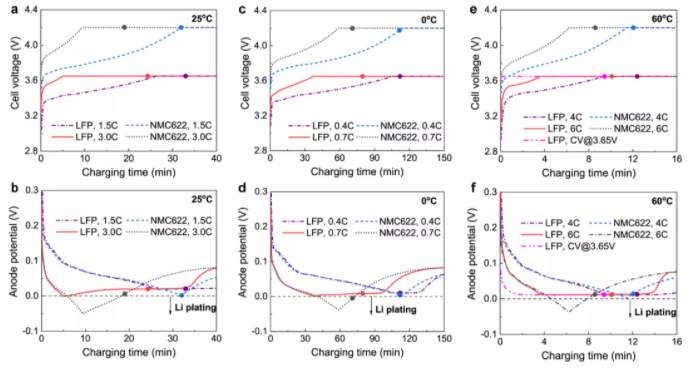 如圖3所示,磷酸鐵鋰電池在室溫下最快可實現(xiàn)20分鐘 (3C)充電,而在低溫(0℃)下,只能實現(xiàn)80分鐘(0.7C)充電。相反,如果在充電之前先將電池加熱至60℃,磷酸鐵鋰電池在6C的倍率下充電也沒有觀察到析鋰現(xiàn)象,而且充電時間可降至10分鐘以內(nèi)。這也意味著,只要加熱速度足夠快,熱調(diào)控電池在任何環(huán)境溫度下都可以實現(xiàn)10分鐘快速充電。