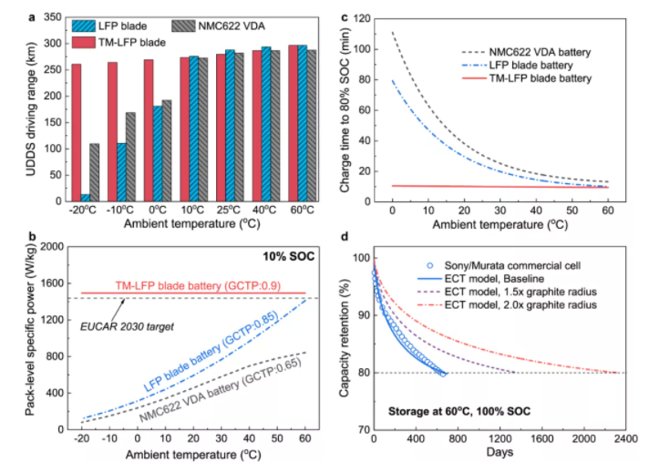 基于團隊前期的自加熱電池結(jié)構(gòu),熱調(diào)控電池每升溫10℃大概消耗1.35%SOC,這意味著從-20℃加熱至60℃需要消耗10.8% SOC。也就是說,即使在-20℃環(huán)境中熱調(diào)控磷酸鐵鋰電池加熱后只剩余89.2% SOC,仍然可以提供大于250公里的續(xù)航里程(圖4a)。此外,該電池在-20℃, 10%SOC下的功率密度仍然達到~1500W/kg(圖4b)。更重要的是,所組裝的40kWh的電池包能夠?qū)崿F(xiàn)大于300kW的峰值功率,這意味著百公里加速時間可維持在3秒以內(nèi),超越了特斯拉!