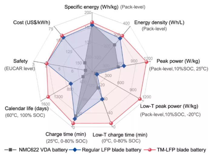 圖5:熱調(diào)控磷酸鐵鋰電池、傳統(tǒng)三元電池、磷酸鐵鋰刀片電池的性能指標雷達圖。