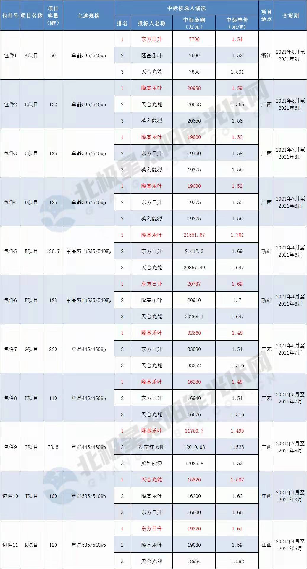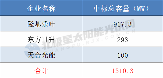 若第一中標(biāo)候選人最終中標(biāo),則最終隆基樂葉、東方日升、天合光能3家企將瓜分此次組件大單。