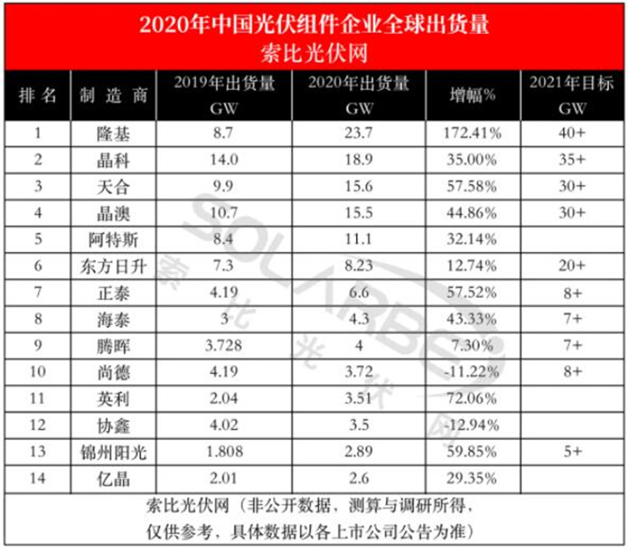 剛剛登陸A股科創(chuàng)板的天合光能“王者歸來(lái)”,出貨量約15.6GW,比上年增長(zhǎng)57.58%,風(fēng)頭正盛。憑借600W+光伏開(kāi)放創(chuàng)新生態(tài)聯(lián)盟的支持,天合光能在高功率組件研發(fā)、生產(chǎn)、應(yīng)用方面取得豐碩成果,預(yù)計(jì)2021年組件出貨量將達(dá)到30GW以上。