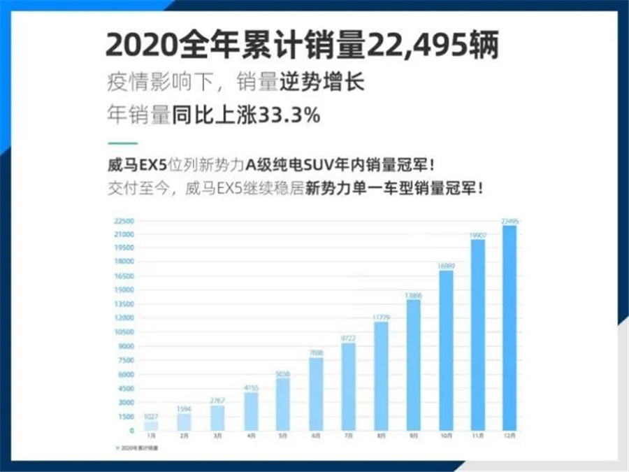 2020年,威馬沒有再給自己做預(yù)定的銷售目標(biāo),這一年,威馬完成了22495量的交付,同比增長33.3%。
