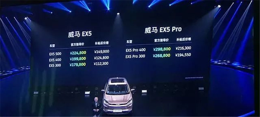 六天后,威馬EX5亮相,但威馬當(dāng)時(shí)僅公布了外觀,車輛續(xù)航里程、動(dòng)力性能,以及具體配置等細(xì)節(jié)均處于保密狀態(tài)。2018年4月20日,威馬在京正式公布了其首款量產(chǎn)車——純電動(dòng)SUV EX5的售價(jià),包括3個(gè)車型共6個(gè)配置,售價(jià)17.98萬—29.88萬,補(bǔ)貼后售價(jià)11.23萬—21.63萬。