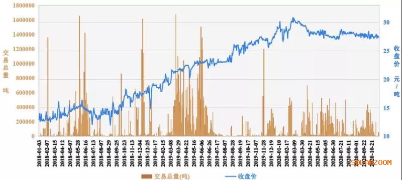 圖2廣東碳交易二級(jí)市場(chǎng)交易總量及收盤價(jià)趨勢(shì)圖