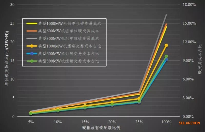基于前述規(guī)則,筆者以目前參與廣東碳市場(chǎng)的典型火電燃煤機(jī)組(裝機(jī)容量分別為300MW、600MW和1000MW)作為研究對(duì)象,測(cè)算在不同碳價(jià)格和不同有償配額比例情況下,電廠購(gòu)買碳配額的單位交易成本以及占發(fā)電機(jī)組變動(dòng)(燃料)成本的比重。