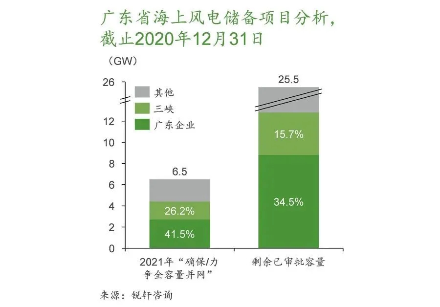但是,如三峽陽西沙扒3至5期等多數(shù)項(xiàng)目僅剛進(jìn)入開工建設(shè)階段,多數(shù)項(xiàng)目未啟動(dòng)風(fēng)機(jī)吊裝,而部分項(xiàng)目仍未鎖定吊裝船及團(tuán)隊(duì),若不對(duì)“全容量并網(wǎng)”條件放寬要求,2021年目標(biāo)預(yù)計(jì)將難以實(shí)現(xiàn)。截止2020年末,廣東省共計(jì)約32GW的海上風(fēng)電項(xiàng)目已獲得審批(未并網(wǎng)),減去該意見中“確保”2021年并網(wǎng)的3.9GW項(xiàng)目,仍有28.1GW的項(xiàng)目無法進(jìn)入中央補(bǔ)貼目錄。