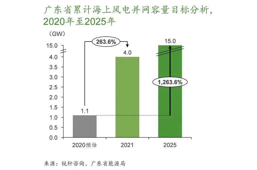 該意見提出較為樂觀的發(fā)展目標(biāo)。根據(jù)項(xiàng)目進(jìn)展情況,截止2020年末,預(yù)計(jì)廣東省累計(jì)并網(wǎng)海上風(fēng)電容量1.1GW,與該意見的2021年目標(biāo)相比需當(dāng)年新增3.9GW。“十四五”期間,目標(biāo)共新增13.9GW,累計(jì)海上風(fēng)電并網(wǎng)容量暴增1263.6%。