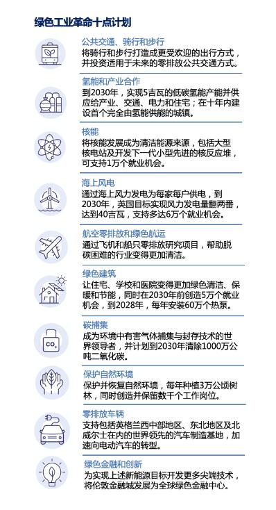 去年11月,英國政府公布《綠色工業(yè)革命十點(diǎn)計劃》(The Ten Point Plan for a Green Industrial Revolution)?!妒c(diǎn)計劃》聚焦英國在綠色產(chǎn)業(yè)擁有優(yōu)勢并將重點(diǎn)發(fā)展的十個領(lǐng)域,闡述政府將采取的舉措,旨在實(shí)現(xiàn)社會和經(jīng)濟(jì)更好的重建、支持綠色就業(yè)、以及加速實(shí)現(xiàn)凈零排放目標(biāo)。舉措包括:在2030年前停止銷售汽油和柴油新車(比原計劃提早10年),以及采取新措施推動英國成為世界碳捕獲領(lǐng)域的領(lǐng)導(dǎo)者。該計劃將調(diào)用120億英鎊的政府投資,并擬在2030年前促進(jìn)3倍以上預(yù)計400億英鎊的私營部門投資,創(chuàng)造多達(dá)25萬個綠色就業(yè)機(jī)會。