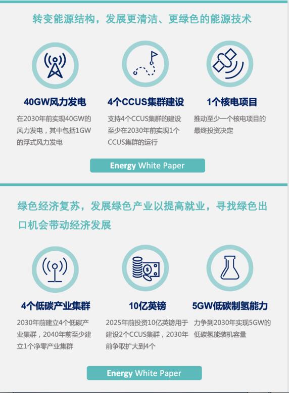 《十點(diǎn)計劃》之后,英國緊隨其后發(fā)布了《能源白皮書:賦能凈零排放未來》(The Energy White Paper : Powering Our Net Zero Future)。這是英國13年來的第一份能源白皮書。該文件清晰介紹了凈零排放挑戰(zhàn)所帶來的機(jī)遇,并針對能源轉(zhuǎn)型、支持綠色復(fù)蘇、以及為消費(fèi)者創(chuàng)造公平交易環(huán)境三項關(guān)鍵議題制定了多項舉措,致力通過高達(dá)2.3億公噸的二氧化碳減排量,在2032年前減少能源、工業(yè)和建筑領(lǐng)域的碳排放。《白皮書》提出到2050年將英國大陸架轉(zhuǎn)變?yōu)閮袅闩欧排璧氐某兄Z,并同意“北海過渡協(xié)議”轉(zhuǎn)型。與此同時,還計劃在2030年前每年支持22萬個就業(yè)機(jī)會。