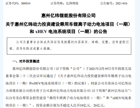 2月19日晚,億緯鋰能發(fā)布公告,旗下公司擬分別投資10億元、26億元投建“乘用車鋰離子動力電池項目(一期)”和“xHEV電池系統(tǒng)項目(一期)”項目。