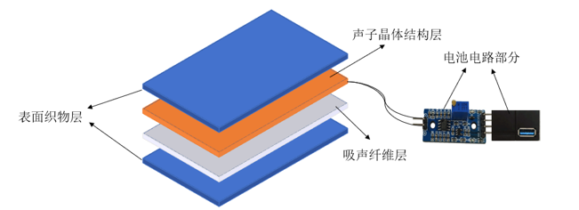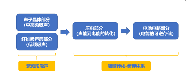 該降噪發(fā)電窗簾結(jié)構(gòu)簡(jiǎn)單且適用范圍廣,主要由四大部分組成:1、聲子晶體部分;2、吸聲纖維層部分;3、壓電部分;4、電池電路部分。主要設(shè)計(jì)思路如下圖: