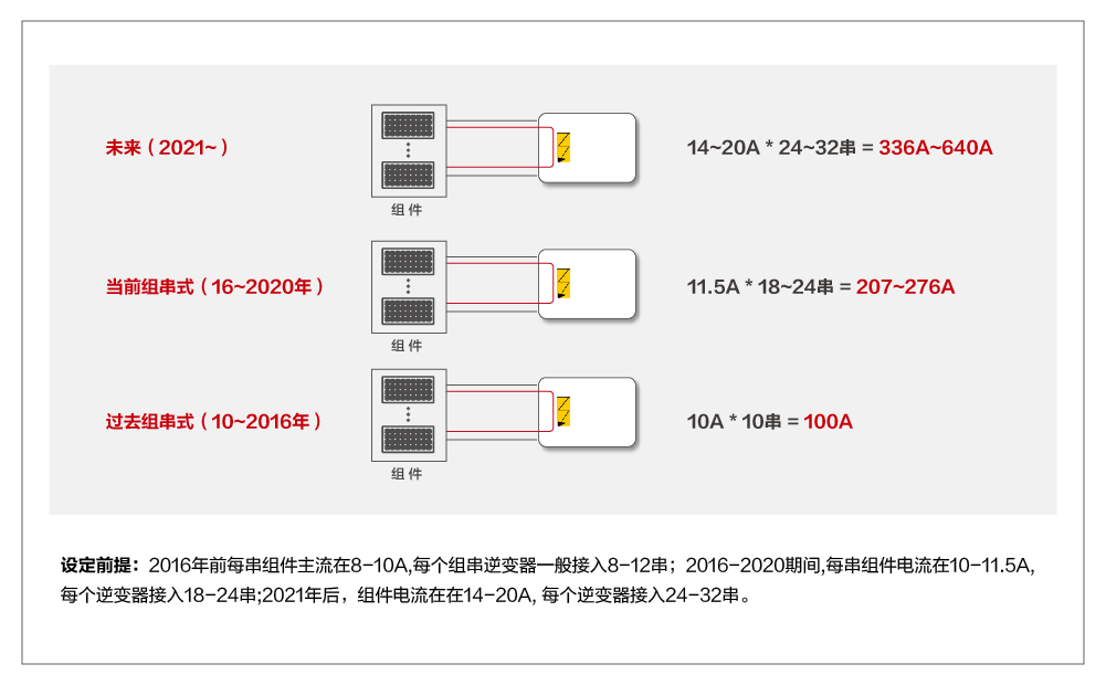 我們看到,組件電流越來(lái)越大,逆變器功率或匯流箱對(duì)應(yīng)的組串?dāng)?shù)量也不斷增加。
