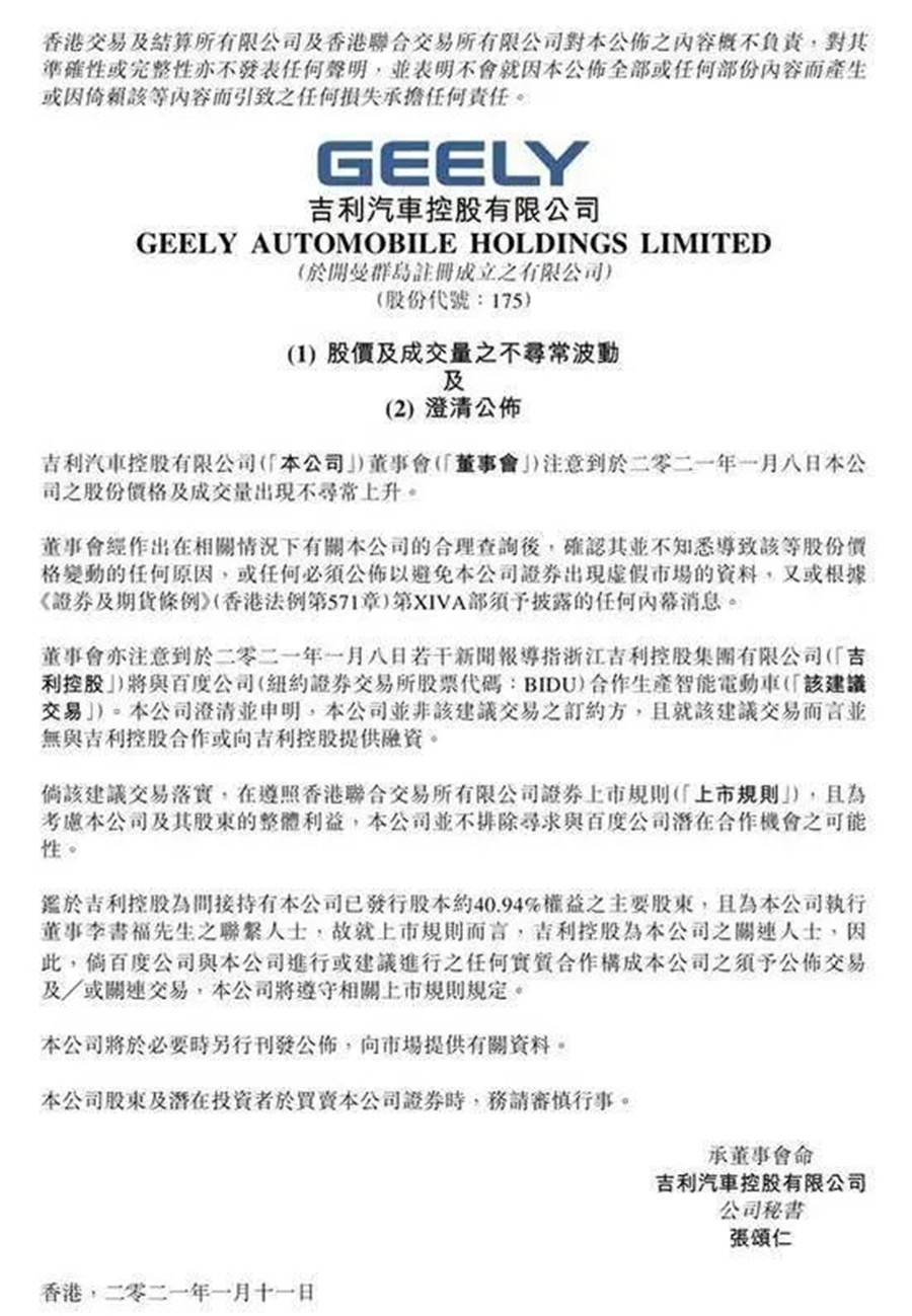 畢竟,這種“猶抱琵琶半遮面”的態(tài)度,更能讓市場(chǎng)上的資金猜個(gè)虛虛實(shí)實(shí);反正車什么時(shí)候造出來,造個(gè)什么樣的車,都不影響股價(jià)猶如扎了“強(qiáng)心針”一樣瘋漲。自打雙方將要合作造車的消息一出,百度和吉利的股價(jià)就如同2020年新能源車企的股價(jià)一樣,連續(xù)上漲。